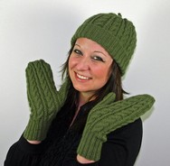 Designer: Nancy Shroyer | Cable Cap & Mittens ![]() 3 skeins Brown Sheep Nature Spun, sport weight 1.75/oz, 184 yds. “Nervous Green” 1 1/2 for cap, 1 1/2 for mittens. | Lace Hooded Cowl ![]() 3 (small/med) or 4 (large) Skeins Brown Sheep Nature Spun Sport Weight. 184 yds/1.75 oz. “Bamboo” | ||