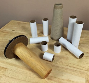 By pressing the rigid tube against the flat top of the spindle, the yarn could easily be slid upward as a complete ball of yarn and placed onto the tube. We then developed a variety of different sizes of tubes.